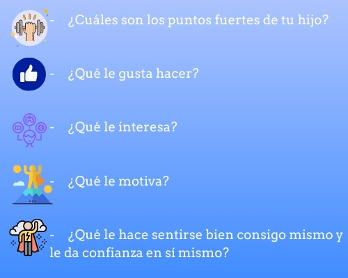 Las respuestas a estas preguntas te ayudarán a elegir las actividades, los programas, las aficiones, que le permitan desarrollar sus preferencias y habilidades. De este modo logrará conocerse mejor y le ayudará a tener una buena autoestima.