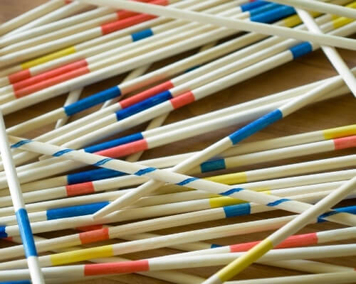 El juego consiste en mezclar 26 palitos adornados con distintos colores en una mesa. Cada color le da un valor a cada palito. Se debe retirar uno a uno cada palito sin mover ni un milímetro el resto. Hay que tener en cuenta los puntos que se ganan con cada palito para el recuento final. La persona que más puntos consiga es el vencedor. También puede jugarse sin darle valor a los palitos y la persona que más palitos consiga gana.